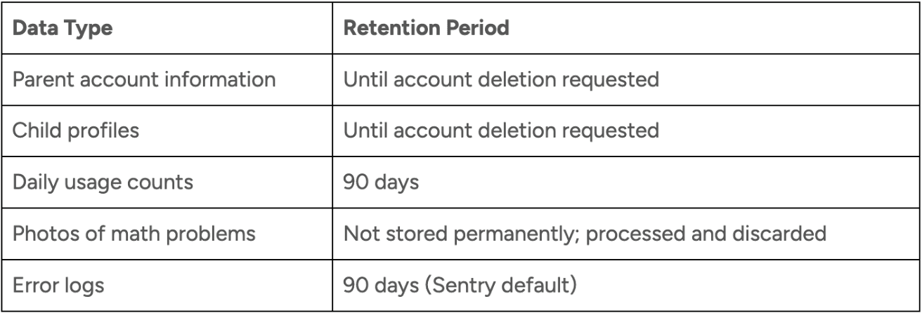 Delete Your Child's Information - You can delete your account and all associated child data at any time. This permanently deletes all parent account data, child profiles, usage history, and device sessions: